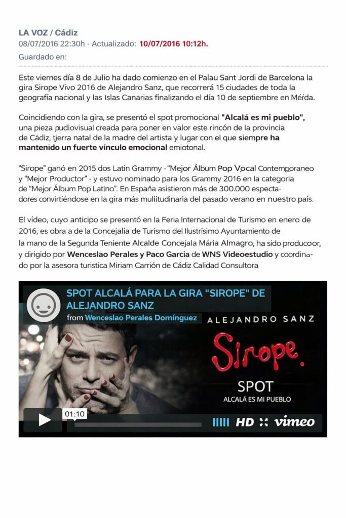 WNS Videostudio Produces “Alcalá es mi pueblo” Spot for Alejandro Sanz’s “Sirope Vivo 2016” Tour.