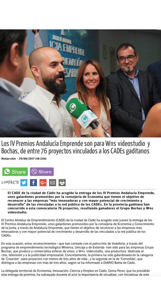 On this occasion, the awards — sponsored by Vodafone through the Minerva technology entrepreneurship program, Unicaja, and Extenda — were presented to Grupo Bochas, which produces and markets wine spheres, and Wns Videostudio, a production company dedicated to film, television, and corporate advertising. Specifically, Grupo Bochas received the award in the “Creation” category — for projects with less than three years of activity — while Wns Videostudio was recognized in the “Consolidation” category, which distinguishes companies with more than three years of activity, as reported by DIARIO Bahía de Cádiz.